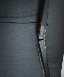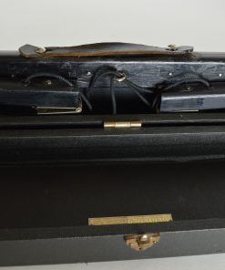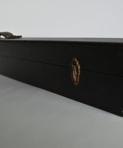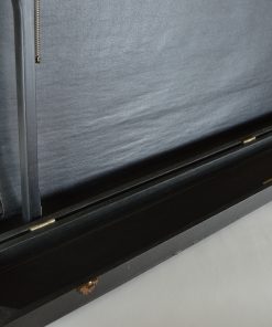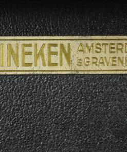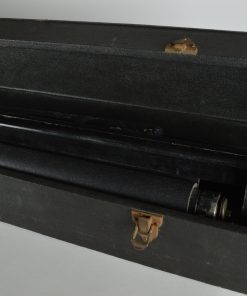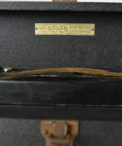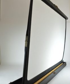 Bijzonder, stijlvol uitrolbaar projectiescherm. Het scherm is opgeborgen in een zwart geschilderde houten koffer, bekleed met zwart leer, voorzien van een leren hengsel. Met het leren hengsel aan de binnenzijde wordt het scherm naar boven getrokken waardoor het houten mechanisme aan de achterzijde zich prachtig ontvouwd en het scherm klaar is voor gebruik. Het doek met aluminium coating is aan de achterzijde zwart, en aan de voorzijde wit opgespoten met een stijlvolle zwarte omlijsting zoals dat hoort bij een prachtig antiek filmdoek. WaarschijnlijkĀ geproduceerd in de jaren rond 1940. In de koffer treft men een intrigerend koperen naamplaatje aan met de tekst: Heineken Amsterdam – ’s Gravenhage. Afmetingen van het feitelijke scherm: 99 x 75 cm.