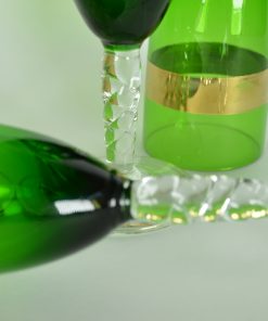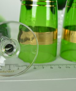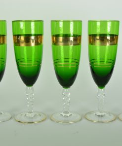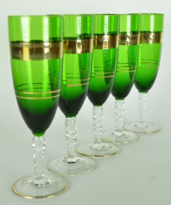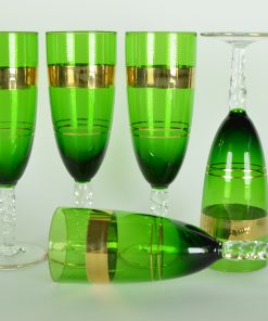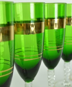 Set van vijf sfeervolle, antieke groene champagne glazen met op de kelk drie gouden randen, een brede en twee smalle. Langs de rand van de voet loopt een gouden biesje. De stam is gedraaid, de kelk heeft een diameter van 5 cm.