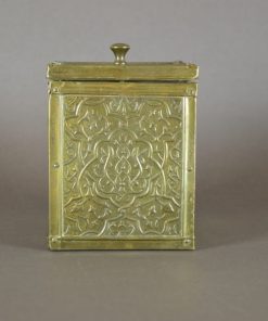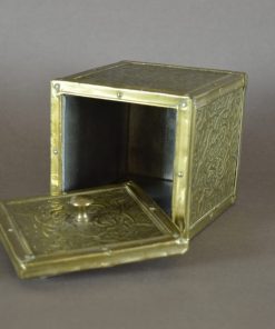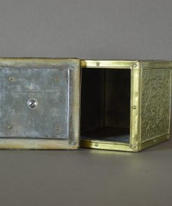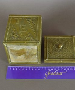 Unieke, prachtig bewerkte goudkleurige theebus voor thee of voor andere zaken. De houten kern is aan de buitenzijde bekleed met messing (koper) en aan de binnenzijde met zink. Dit zorgt voor een uitstekend bewaarklimaat. Op de voorkant staat het Engelse woord ’tea’ geschreven. De deksel heeft een stevige greep van koper. Geproduceerd rond 1920.