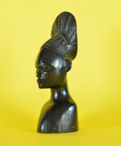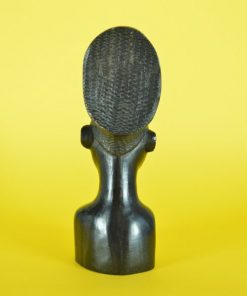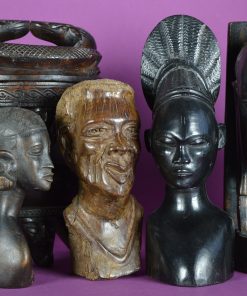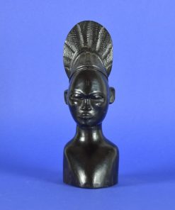 Deze prachtig bewerkte glanzende buste is gesneden uit een stuk ebbenhout en is vermoedelijk gemaakt in de vroegere Belgische kolonie Congo door de Mangbetu stam. Dit soort beelden werd in opdracht gesneden en werd door kolonialisten meegenomen naar Europa rond de jaren 1930. De overige bustes op de foto zijn elders op deze site te vinden.
