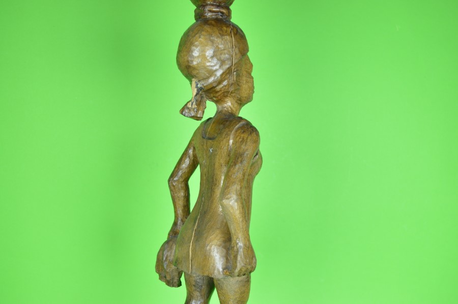 Uniek beeld van een moderne vrouw met kort jurkje en fijne gelaatsuitdrukkig. Zij draagt een olijfvormige kruik op het hoofd en een handdoek in haar hand. Ze lijkt op weg naar iets of in beweging. Ze is uit 1 stuk hardhout gesneden. Op het voetstuk het woord; Saïeh of Snïeh.