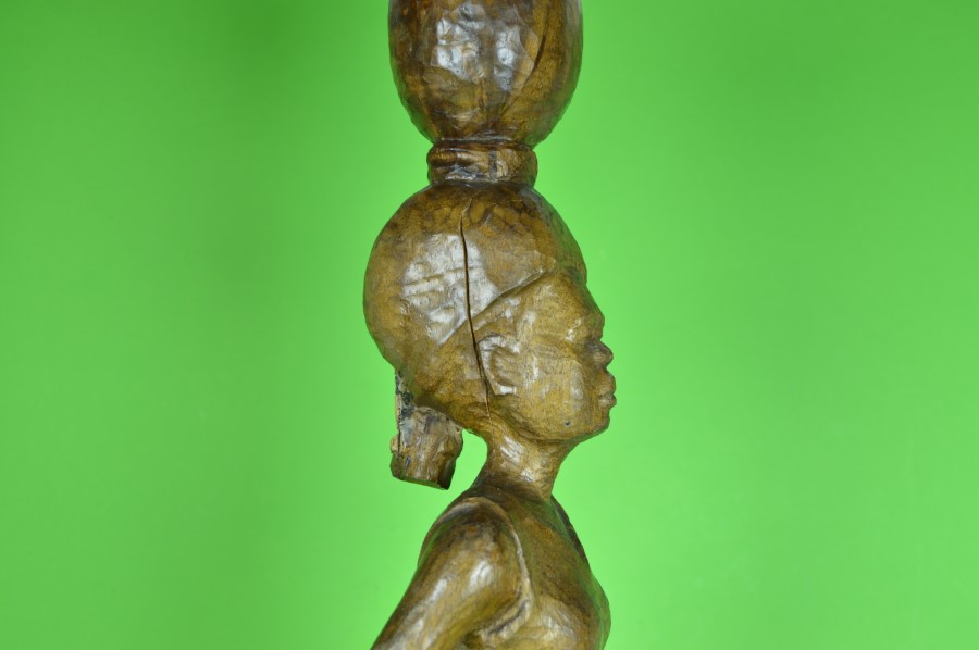 Afrikaanse vrouw met jurkje en kruik op het hoofd – beeld van hout