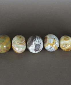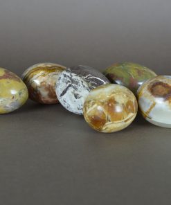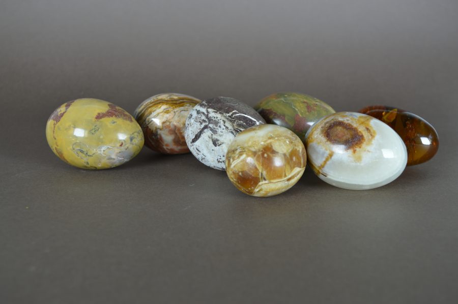 Prachtige, glanzend gepolijste decoratieve eieren, met woeste patronen en lijnen, in hoofdzakelijk bruin- en aardetinten en groen. Op de foto van links naar rechts: ei 1. geel bruine jaspis, ei 2. groen bruine jaspis, ei 3. agaat, ei 4. marmer glanzend bruin en ongepolijst wit, ei 5. agaat, ei 6. agaat en ei 7. verhitte barnsteen.
