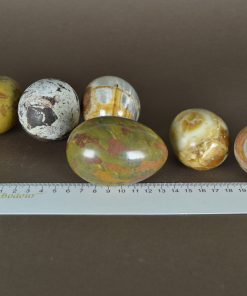 De opgegeven afmeting is van de groenbruine jaspis, het grootste ei, 8 cm hoog. Het gewicht is van de zeven eieren samen.