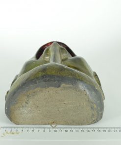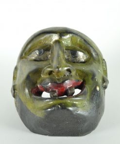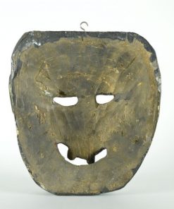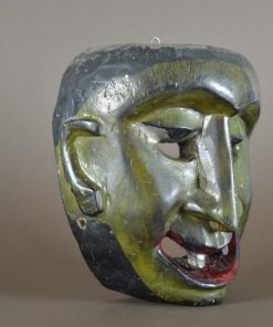 Dit antieke, bijzondere, expressieve dansmasker heeft een mooie groenachtige patina. De maskers werden vaak gesneden uit balsahout en vervolgens gekleurd in dit geval in een bijzonder soort groen, het heeft een rode mond waarin nog maar twee tanden zitten.