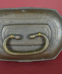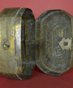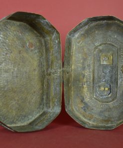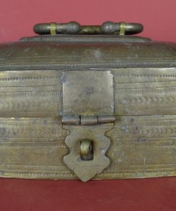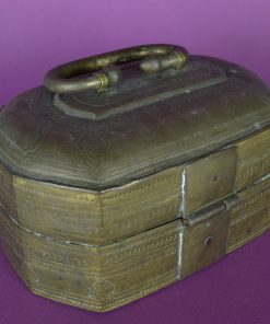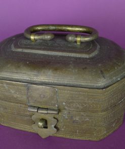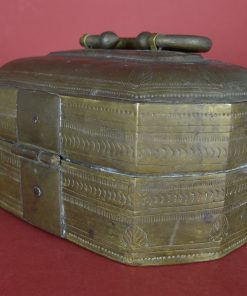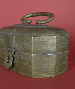 Stevig, solide,achtkantig antiek koperen (schat) kistje met prachtig gevormd hengsel en uitstekend sluitwerk. Fijn gedecoreerd met fantasievormen en met een blaadjes op elke hoek.