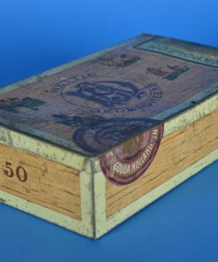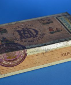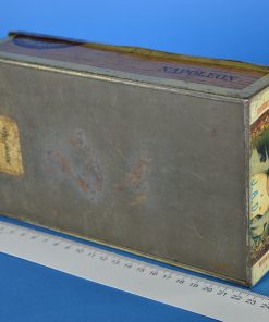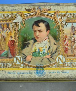 Antiek sigarenblik met een afbeelding van Napoleon Bonaparte aan de buiten- en binnenzijde van de deksel. Het sigarenblik werd geproduceerd rond 1910 door J.A. Donker Sigarenfabriek in Gouda, de grootste Goudse sigarenfabriek in de eerste helft van de 20e eeuw. Aan de onderzijde van het blik een oude sticker met het woord Amarillo, dat betekent voor sigaren ‘licht gekleurd’.