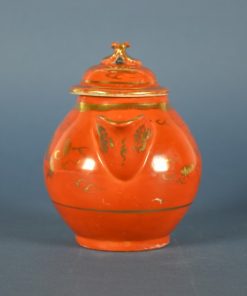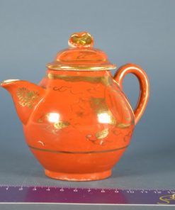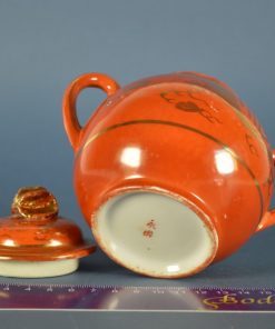 Melkkan en suikerpot uit een antiek servies uit de periode rond 1920. Handgeschilderd in een prachtig gloed- en sfeervol warm oranje, met gouden draken en symbolen.Ā De greep op de deksels bestaat uit twee tegen elkaar aangelegde met goud beschilderde bloemblaadjes