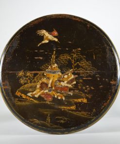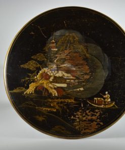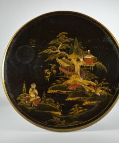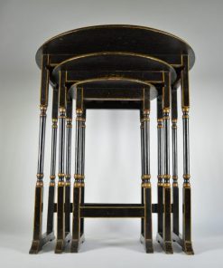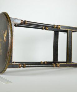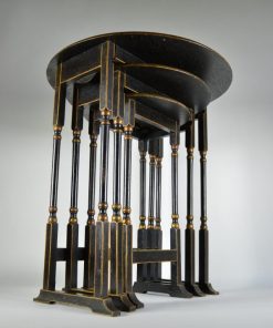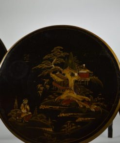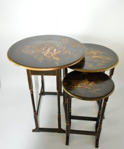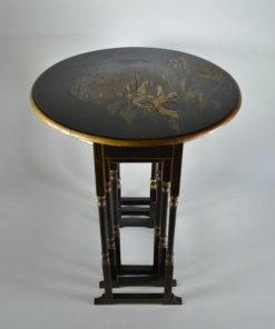 Set van drie bijzondere, sfeervolle antieke Chinese bijzettafels uitgevoerd in lak. De tafelbladen zijn handbeschilderd voorstellende dorpjes, mensen, vogels en bootjes in een landschap met bergen en rivieren. De tafels worden gedragen door een elegant onderstel. De vorm van de poten is afwisselend rechthoekig- of cilindervormig, markant detail zijn de goud geschilderde ronde vormen. De constructie is stabiel doordat de poten onderling verbonden zijn. Het geheel is zwart gelakt en afgewerkt met een gouden bies. De tafels zijn makkelijk in en uit elkaar te schuiven. Vermoedelijk gemaakt in de jaren 1890-1920. In originele staat.