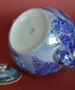 Prachtige, unieke, sfeervolle Chinese theepot met bol buikje en een decoratie van windmolens in een Hollands landschap met water en zeilboten. De pot is voorzien van blauw parelmoerglazuur en gouden accenten. De greep van de deksel en het bamboevormige handvat zijn uitgevoerd in goud. In de pot hangt een uitneembare wit geglazuurde theezeef. Vermoedelijk geproduceerd in China rond 1930.