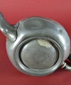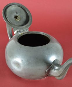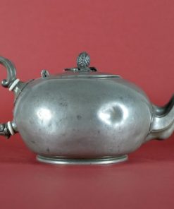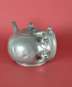 Decoratieve, sfeervolle antieke theepot gedecoreerd met bladeren en een dennenappelvormige greep op de deksel. Het heeft een sierlijke handvat met twee wit porseleinen ringen om de warmte te isoleren, waardoor het koel blijft. De basis van de tuit is pompoen-lobbig gevormd. De deksel scharniert zonder speling. Waarschijnlijk geproduceerd door James Dixon & Sons, Sheffield England rond 1880 de Victoriaanse tijd.