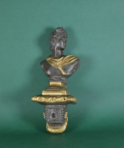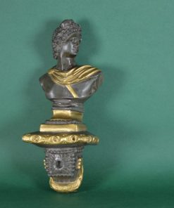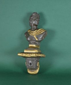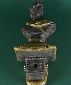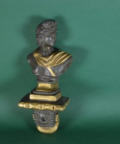 Decoratieve buste van de Griekse god Apollo. De wandsculptuur is donkerolijfgroen en goud gekleurd, vormgegeven in empirestijl naar voorbeeld van de klassieke oudheid.