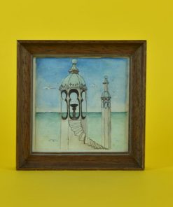 Deze aquarel toont twee Grieks aandoende tempeltjes met de zee op de achtergrond. Er leidt een trap naar één van de tempels. Prachtig getekend, zeegroen en blauw gekleurd. Alleen de vogels bewegen in de lucht.