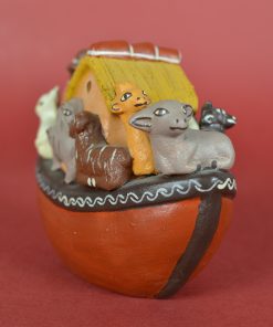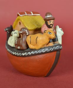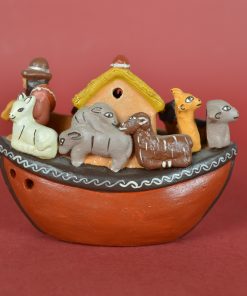 Schattige primitieve voorstelling van de boot van Noach. Op het dek een huisje met rieten dak. Op de boeg Noach omringt door dieren.