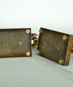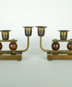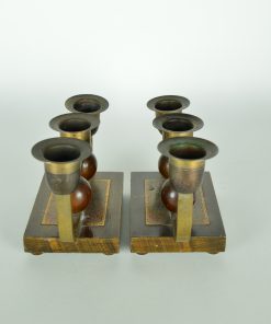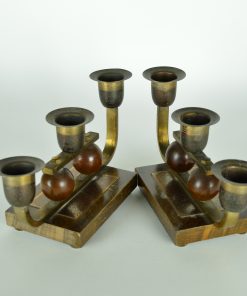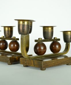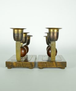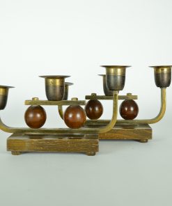 Prachtige, zeldzame, strak vormgegeven kandelaars uit de Art Deco periode. De buitenste armen zijn gevormd uit een dikke platte reep geelkoper. De palissander houten voet op vier hoeken verhoogd, is gedeeltelijk bedekt met een koperen plaatje, wat het kaarslicht mooi weerkaats. De twee houten bollen in het centrale deel zijn van een roder houtsoort. Samengehouden door een reep koper waarop de derde kaarsenhouder staat. In de geel- met roodkoperen kelken past een groot formaat standaard kaars. Geproduceerd in de jaren rond 1910.
