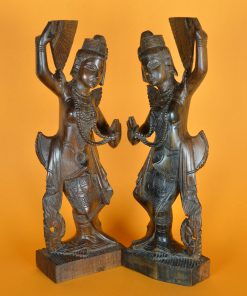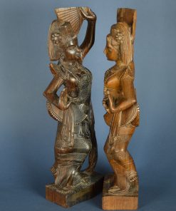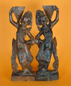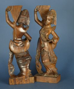 Set van twee prachtig handgesneden beelden van danseressen. Ze dansen met een waaier in de hand en een ketting in de andere. De danseressen zijn gespiegeld aan elkaar. Ze zijn gedetailleerd en toch gestileerd vormgegeven. Het hout heeft een mooie glans met oranje vleug.