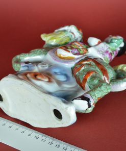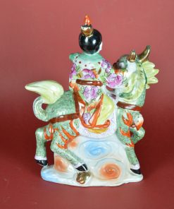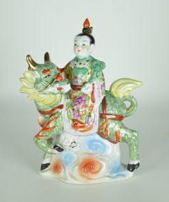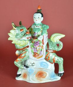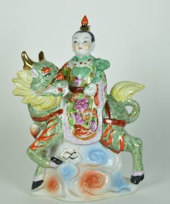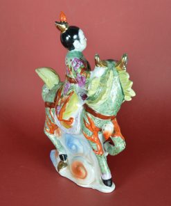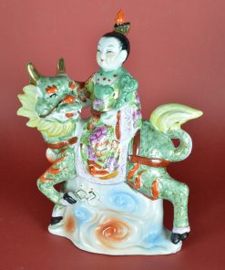 Prachtig beeld van een meisje rijdend op een Chinese tempelleeuw, of wel foo dog. Het gezichtje van het meisje is schitterend fijn geschilderd. Ze houdt een soort sleutel in de arm en draagt een hoofdtooi met vlam. De leeuw heeft gouden hoorns.