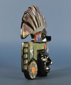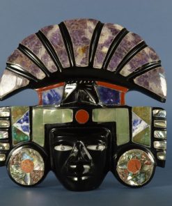 Azteken masker met hoofdtooi. Schitterend en uniek handgemaakt beeld van obsidiaan, ingelegd met diverse (half) edelstenen zoals lapis lazuli, jade, parelmoer en zonnesteen. Mexico, tweede helft 20e eeuw.