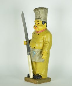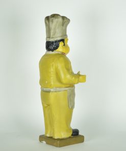 Grappig beeld van een Franse chef kok in overwegend geel tinten. De kok kan allerlei soorten bestek in handen gegeven worden, of een leuke rood-wit geblokte theedoek over de arm. Leuk als cadeau voor allerlei gelegenheden. Rond 1975 een populair item. Het mes en de lepel zijn elders te vinden op de site.