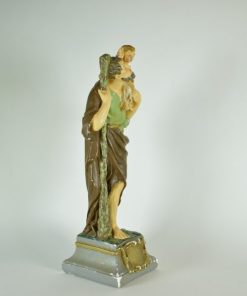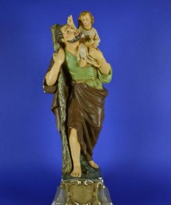 Zeldzaam en indrukwekkend beeld van de heilige Christoffel, met Jezus op de schouder. Ook nu nog is Christoffel een actuele en populaire heilige. In katholieke landen hebben veel mensen een Christoffelbeeldje in hun auto liggen om hen te beschermen tijdens de reis. Kleine objecten met de afbeelding van Christoffel zijn makkelijk mee te nemen door reizigers en dienden voor privédevotie.
