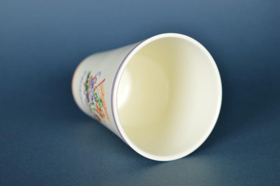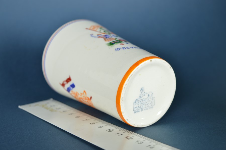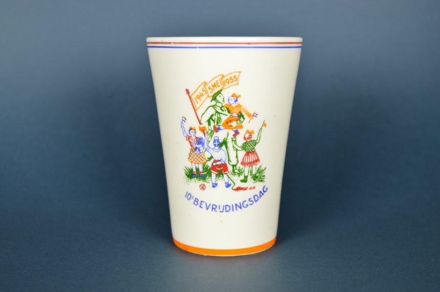 Vrolijke beker ter herinnering aan de bevrijdingsdag op 5 mei 1945. De bekers werden uitgereikt aan de schoolgaande kinderen in 1955 ter herinnering aan 10 jaar bevrijding van Nederland. Geproduceerd door Petrus Regout & Co Maastricht.