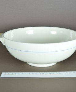 Lekkere ruime schaal of beslagkom in een zonnige crème wit. De kom heeft twee grepen met een geel en oranje streepje. Langs het midden loopt een subtiel blauw randje. De binnenzijde toont de bekende drie bakmerkjes. Geproduceerd rond 1930 in de Art Deco periode / Amsterdamse school stijl, door Société Céramique Maestricht.