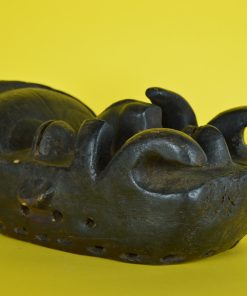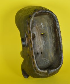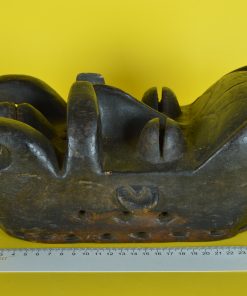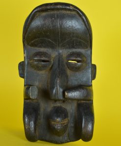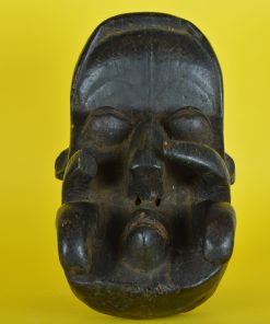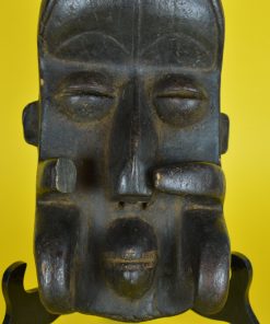 Fascinerend, uit één stuk hout gemaakt Nyabwa of Gre – natuurkrachten- masker, door de Bete stam, uit Ivoorkust Afrika. De kleine mond met heeft twee rijen kleine tanden, subtiel aangebrachte wenkbrauwen, een markante neus met een prachtige extra subtiel uitgestoken neusbrug, neusgaten, gestileerde oortjes en een overlappende rand bij de haargrens van het extreem geprononceerde voorhoofd. De maskers uit deze streek hebben als overeenkomst, het vooruitgestoken voorhoofd, de kleine mond en het feit dat het gezicht verborgen ligt achter op tentakels lijkende uitstulpingen. Ooit gebruikt om de vijand angst in te boezemen en om de drager magische krachten en bescherming te geven. Langs de rand aan de achterzijde zijn gaten aanbracht om het masker te kunnen voorbinden.