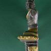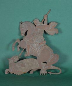 Gestileerde voorstelling van een biddend meisje. De voorstelling is gemaakt in een prachtige, eenvoudige vloeiende belijning van geel koper ingelegd met groen vilt. Het is gemonteerd op blank eikenhouten. Vermoedelijk gemaakt rond 1920. Gegraveerd op de achterzijde de letters: M.Thevenet les 9.62.