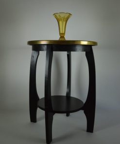 VERKOCHT Deze elegante, prachtig vormgegeven houten bijzettafel uit de jaren twintig van de vorige eeuw, is bijna honderd jaar oud. Het heeft twee etages. Het prachtige koperen blad toont de voor de Art Nouveau periode veel gebruikte sierlijke florale motieven in fantasie patronen die met elkaar vervlochten zijn zonder begin of eind. De tafel getuigt van vakmanschap en liefde voor ambachtswerk.