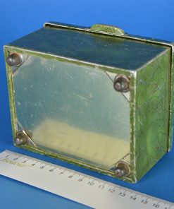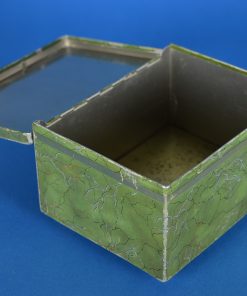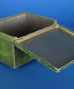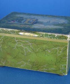 Schattig sfeervol trommeltje met een 17e eeuws tafereel van twee dames met hoepeljurken en grote hoeden, wandelend bij een theekoepel nabij een vijver. Op de achtergrond ontwaart men de middeleeuwse skyline met de kerktoren. De afbeelding is gevat in nagemaakte craquele groen met gouden aders. Het trommeltje staat op vier bolvormige voetjes, dateert vermoedelijk van rond 1910 en is minstens 100 jaar oud.