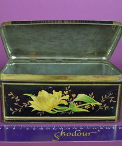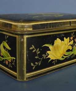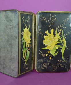 Prachtig, sfeervol antiek blik met zwierige witte irissen tegen een zwarte achtergrond met gouden blad accenten. Vermoedelijk geproduceerd rond 1920.