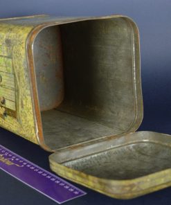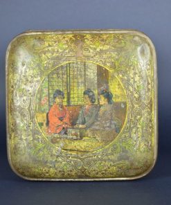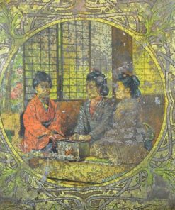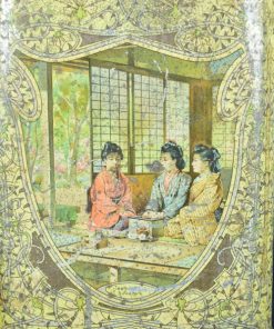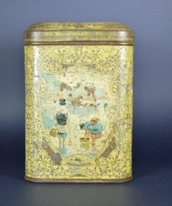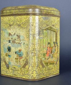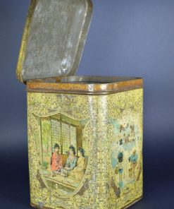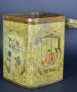 Prachtig, sfeervol, geel gekleurd Japans theeblik. Het is zo groot dat het een opslag theeblik genoemd wordt. Op het blik zijn een aantal scenes te zien. Dames die bijeen zitten en theedrinken met op de achtergrond de bekende Japanse ramen Een strand en zee scene. Het blik is gemaakt rond de jaren 1900.