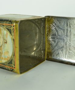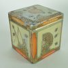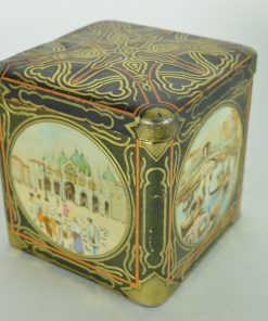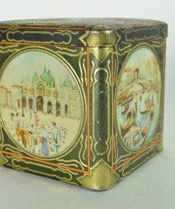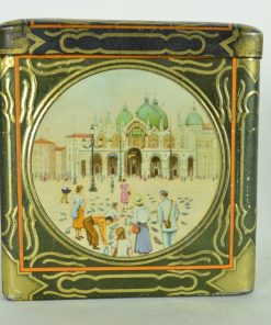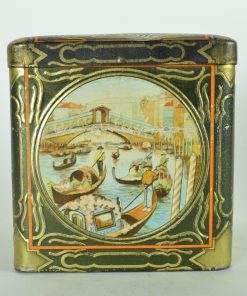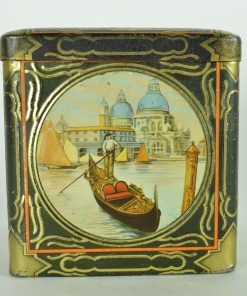 Sfeervol, kleurrijk, oud vierkant blik met vier afbeeldingen van Venetië in een zwart, oranje en goud fantasie cartouche. De deksel heeft een goed werkend scharnier. Tekst aan binnenkant deksel: C.J. Van Houten & Zoon N.V. Kon. Fabriek van cacao en chocolade WEESP – HOLLAND. Geproduceerd tussen 1920 en 1970.