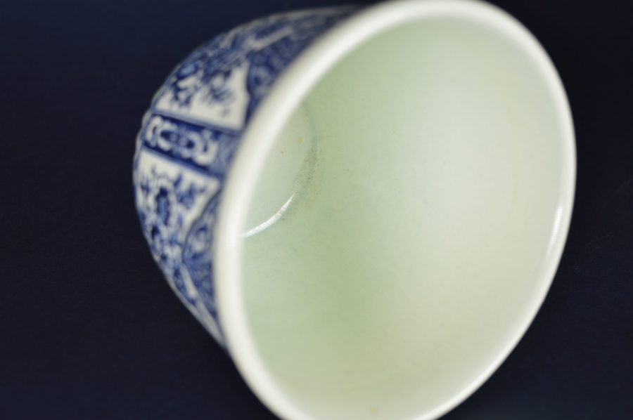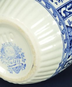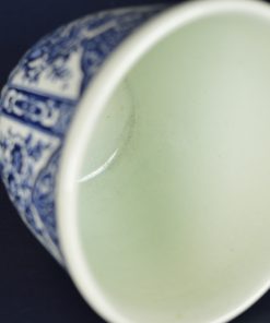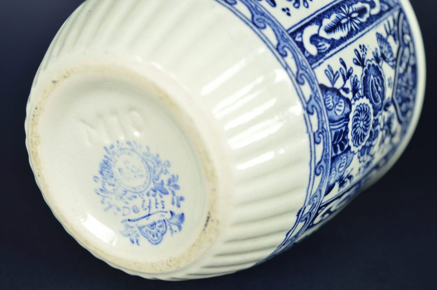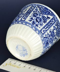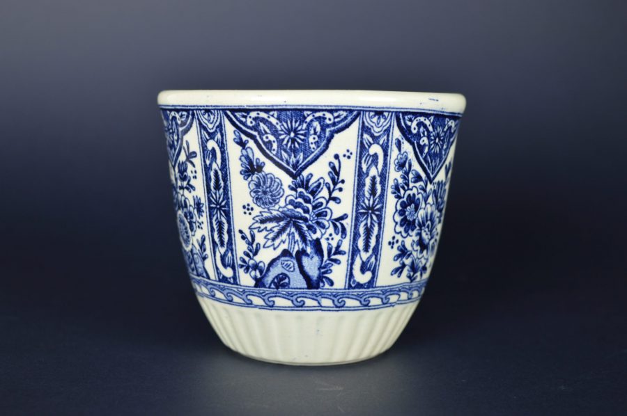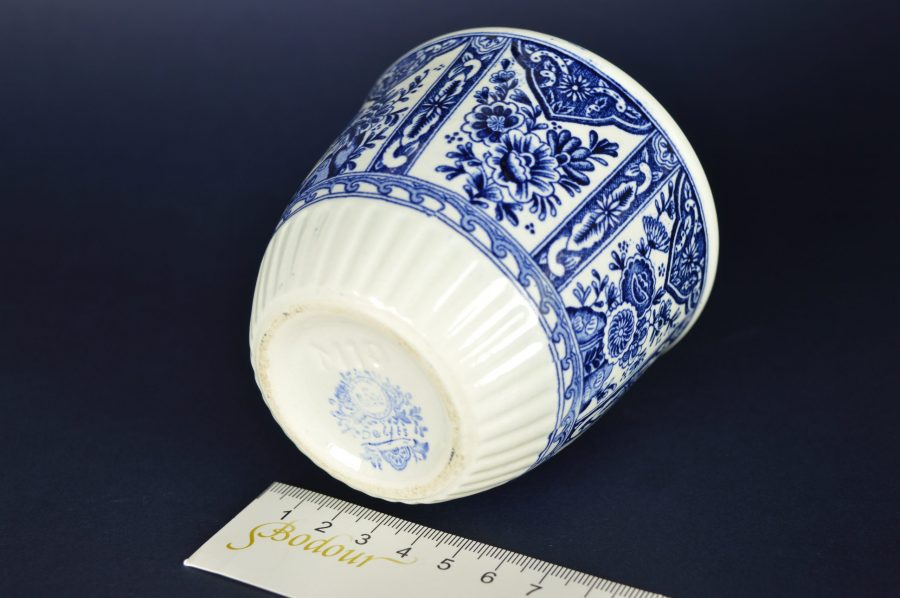 Mooie klassieke kleine bloempot met bloemdecoratie in coulisseachtige setting in blauw op witte basis. Aan de onderkant een rand in geplisseerd relief. Aan de onderzijde gestempeld: Delfts Made for Royal Sphinx Holland by Boch, en blindstempel M10.