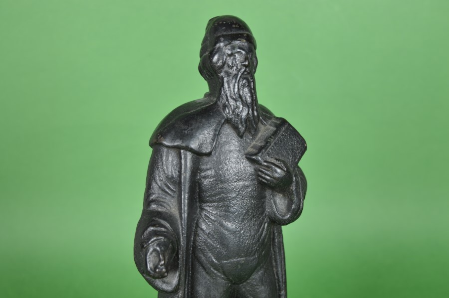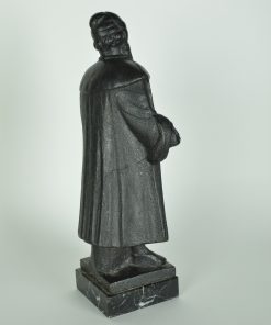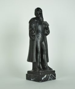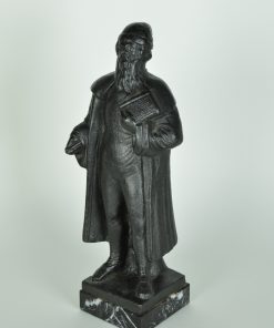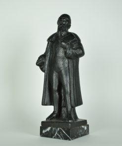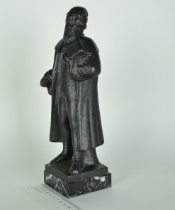 Bijzonder, sfeervol en robuust beeld van Johannes Gensfleisch zum Gutenberg, Gekleed volgens de gebruiken in die tijd houdt hij een de Gutenbergbijbel onder zijn arm, In zijn andere hand houdt hij een aantal losse zet-letters die hij uitvond. Het beeldje staat op een zwart wit geaderde marmeren sokkel en is gemaakt naar evenbeeld van het grote standbeeld van Gutenberg dat staat in Mainz.