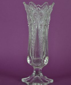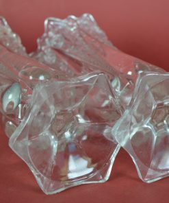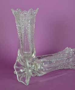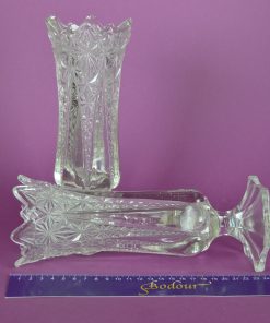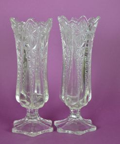 Set van twee prachtige vazen versierd met zes druppelvormige banen verdikt glas wat een prisma-achtig effect geeft. Vandaar de naam in de catalogus; ‘Prism Panels’, Afgewisseld met banen met sterren die naar boven in breedte toe nemen tot en met de kroonvormige rand. De kelk staat op een stabiele zeshoekige voet. Geproduceerd door de Duitse glasfabriek Brockwitz tussen 1915 en 1930.