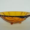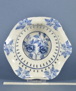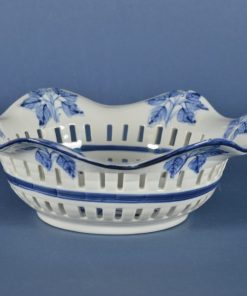 Praktisch brood of fruit schaaltje met witte basis en blauwe beschildering van wilde rozen met knoppen en blad. Het is onregelmatig, niet fabrieksmatig, gevormd, de maat verschilt hier en daar met een halve centimeter. Het heeft een zwierig gevormde geschulpte rand. Twee opengewerkte rijen geven lucht aan de inhoud. Het staat prachtig op tafel met druiven of rode bessen of broodjes