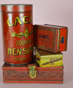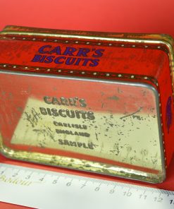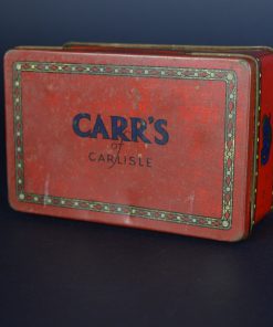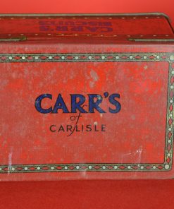 Stak vormgegeven blik waar theebiscuitjes in verpakt werden. Op het rode blik met goudkleurige basis staat de tekst ‘Carr’s Biscuits of Carlisle’ in blauwe letters. Het werd geproduceerd in Engeland door Hudson Scott & Suns limited. Vermoedelijk gemaakt rond 1950.