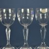 Luxe set van vijf fonkelende geslepen kristallen champagneglazen. De kelk heeft een waaier motief met een achtpuntige ster in het midden van een viervoudig wafelpatroon. De stam is zeskantig geslepen en loopt vanuit een zeskantige knoop taps toe naar beneden. De voet is niet bewerkt.