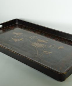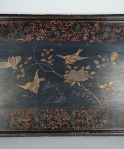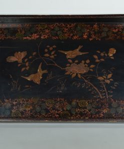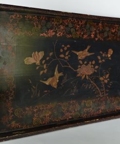 Sfeervol, antiek, handbeschilderd dienblad van Chinees lak. In het centrale deel is een tafereel te zien met vogels en bloemen, omzoomt door een rand met een fantasiepatroon van bloemen. De achterzijde is zwart gelakt. De laktechniek werd gebruik om een voorwerp waterdicht te maken. Het dienblad heeft plaats voor een uitgebreid servies. Gezellig in een keuken of ter decoratie tegen de wand. In China wordt lak zeer gewaardeerd door de glanzende uitstraling. Dienblad is vermoedelijk gemaakt rond 1910.