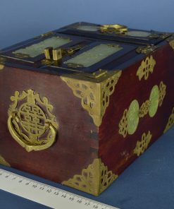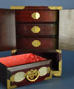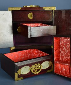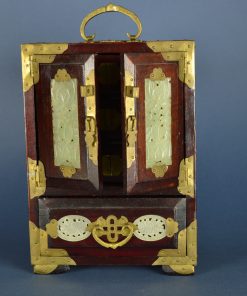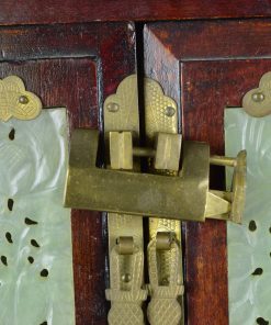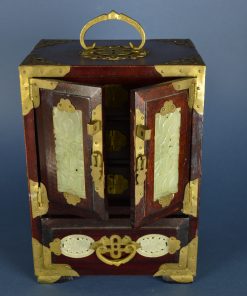 Prachtig, rijk versiert juwelenkastje met vier laden. Achter de mysterieuze schitterend bewerkte deuren voorzien van een gedecoreerd hangslot bevinden zich drie laden, waarvan in twee een aparte indeling voor ringen is gemaakt. De laden zijn bekleed met rood satijn met ingeweefd zilveren fantasiepatroon. Aan de bovenzijde, onder het koperen hengsel het Shuangxi teken dat symbool staat voor ware liefde, het huwelijk en het dubbele geluk. Deuren, zijpanelen en onderste lade zijn ingelegd met groene jade prachtig gesneden in florale motieven. De koperen grepen zijn rijk gedecoreerd. Op elk hoekstuk staat een afbeelding van een vleermuis, ook een symbool voor geluk. Vermoedelijk gemaakt rond 1950 in China.