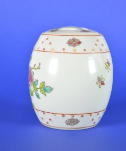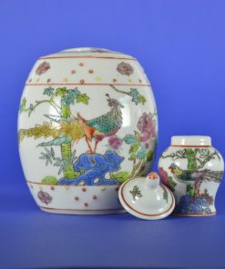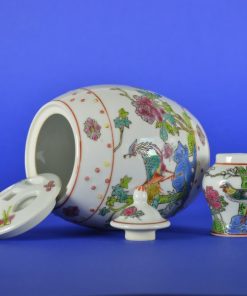 Chinese gemberpot met deksel. Handgeschilderd in prachtige heldere kleuren, voorstellende vogels en vlinders in een landschap van bomen, bloemen en water. Het mini dekselpotje op de foto is verkocht.