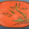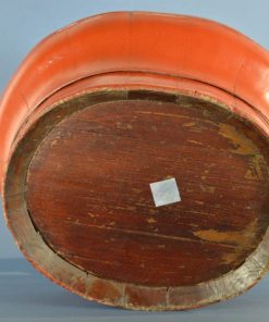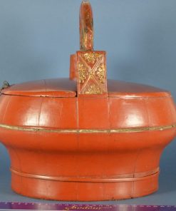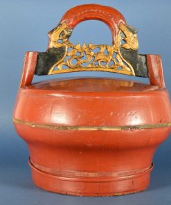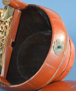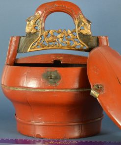 Antiek houten Chinese lunchbox. De box werd meegenomen naar de rijstvelden gevuld met voedsel voor de lunch. Het goud geschilderde handvat bestaat uit prachtig houtsnijwerk met vogels, herten en bloemen. Ca. 1900.