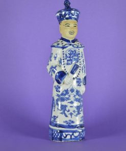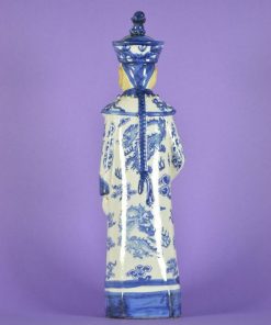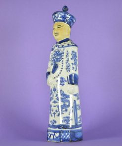 Chinese keizer gekleed in een mantel met vlammende blauwe draken en bloemen. Hij draagt een blauw hoofddeksel, het haar gevlochten in een staart op de rug. Om zijn hals draagt hij een lange ketting met grote kralen, In zijn hand heeft hij een waaier. Het beeld is gemaakt van een bruin-gele klei wat de basis is van de zacht gele, licht bruine tint van het ongeglazuurde gezicht waarop wenkbrauwen, ogen en mond fijn zijn aangebracht. Aan de onderzijde een stempel met chinese karakters.