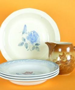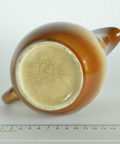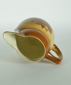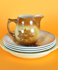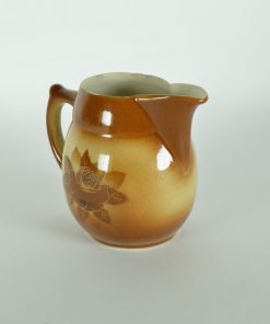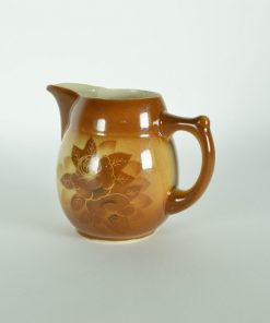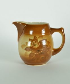 Deze sfeervolle, antieke, redelijk grote chocolademelkkan, in de lijn Juliette van porseleinfabriek Digoin Sarreguemines, is uitgevoerd in een unieke kleur; dégradée in roodachtig chocolade bruin. Het gestileerde bloempatroon is aan de ene zijde groter dan aan de andere zijde. Het handvat heeft een handige vorm waarop de duim goed kan rusten bij het schenken. Het porseleinstempel lijkt op dat van Porselein Mosa Maestricht dat startte in 1900. Vermoedelijk is de kan gemaakt in de jaren rond 1930. Overig servies op de foto is verkocht.