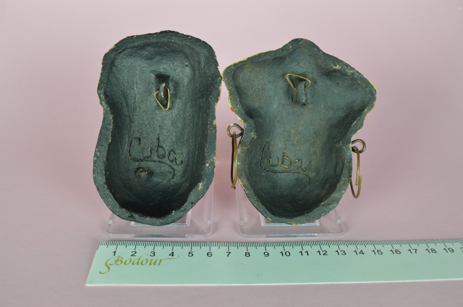 Prachtige kleurrijke kleine maskers van een man en een vrouw. De vrouw heeft een kleurrijke hoofdoek en koperen oorbellen en de man heeft een hoofdband en een gaatje tussen de lippen misschien voor een sigaar of pijpje? Aan de achterzijde een ophang oogje en ingeschreven het woord Cuba.