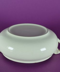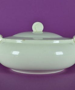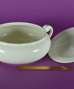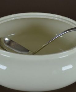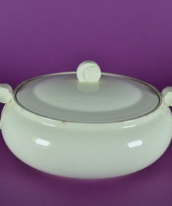 Roomwitte prettig rond gevormde dekschaal, vermoedelijk van Petrus Regout (Sphinx) en gedateerd 1941. De schaal heeft aan weerszijden prachtig gestileerde oren en bijpassende greep op de deksel. Ook leuk om naar Indiaas voorbeeld lekkere kruiden in te bewaren.