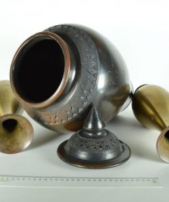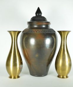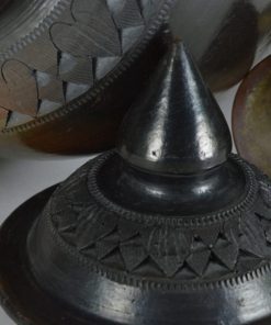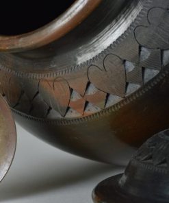 Deze imposante grote decoratieve dekselvaas staat prachtig in elk interieur. De gewelfde vorm loopt naar onderen taps toe en naar boven wijd uit. Gemaakt van robuust aardewerk van stevige klei, in een robuuste kleur donkerbruin doorvlamd met oranje-rood en zwart. Het deksel heeft een greep, prachtig gevormd in lijn van de vaas. Een band langs de bovenkant van de vaas en een band langs het deksel zijn versierd met hartvormen.