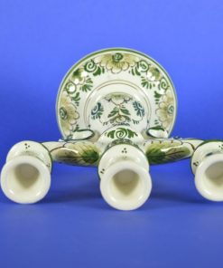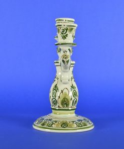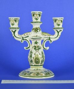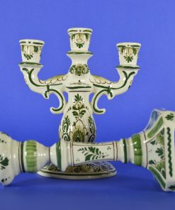 Delfts Groene kandelaar met drie armen, handbeschilderd met florale voorstelling. De kandelaar is afgewerkt met een lijndecoratie in groentinten. De onderkant is geglazuurd en is gemerkt met het beeldmerk ‘DK’, De Kruik en het onderschrift Delftsgroen HandP. Uit de periode 1950-1970.