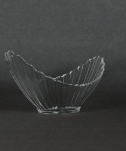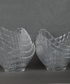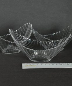 Set van 4 glazen halvemaanvormige dessertschaaltjes. Prachtig, sierlijk, eenvoudig en stijlvol vormgegeven feestelijke schaaltjes met geplisseerde plooien eindigend in een gekartelde rand. Gewicht en maat zijn per schaaltje aangegeven.